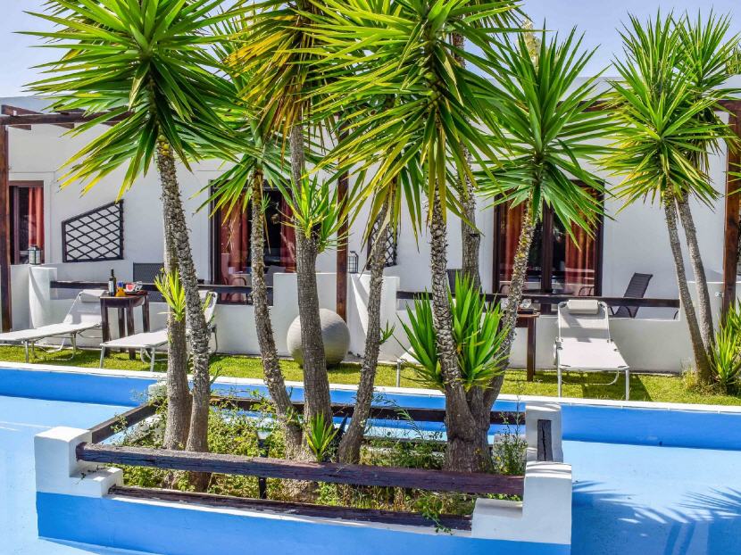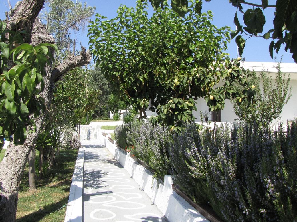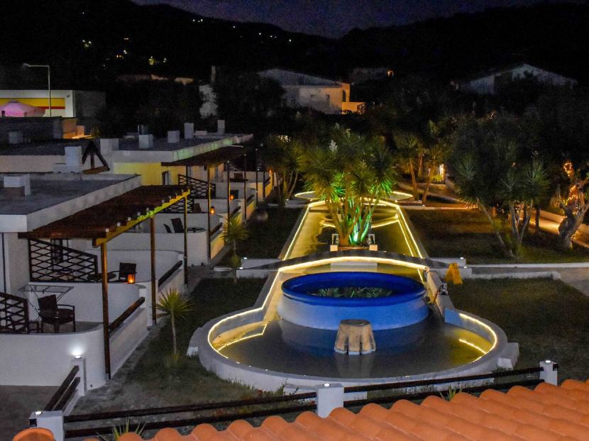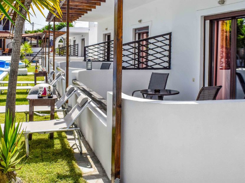Typ A - 5X Studio für 2 Personen (20 qm + Balkon 10 qm): Jedes Studio ist ausgestattet: mit einem Doppelbett, Klimaanlage, Esstisch, Kühlschrank, Kochnische (ohne Herdplatten) mit Geschirr, Teller, Gläser, Wasserkocher, Kaffeemaschine, Badezimmer mit Dusche/WC, Balkon mit Gartenmöbeln und Blick auf dem Garten.