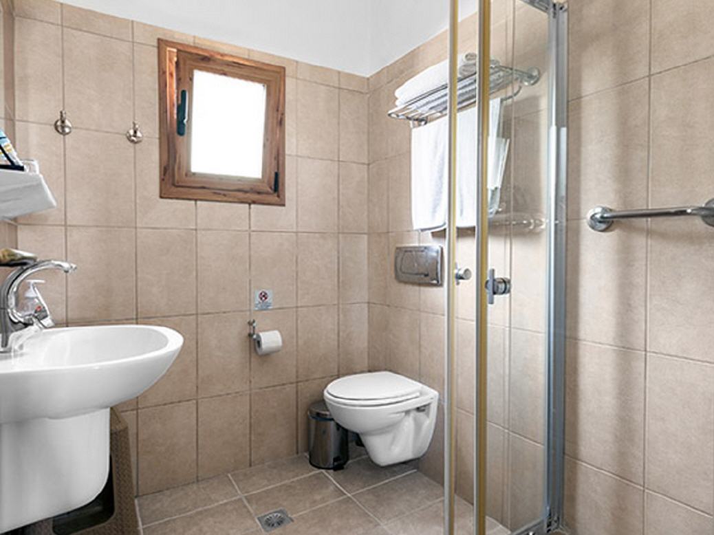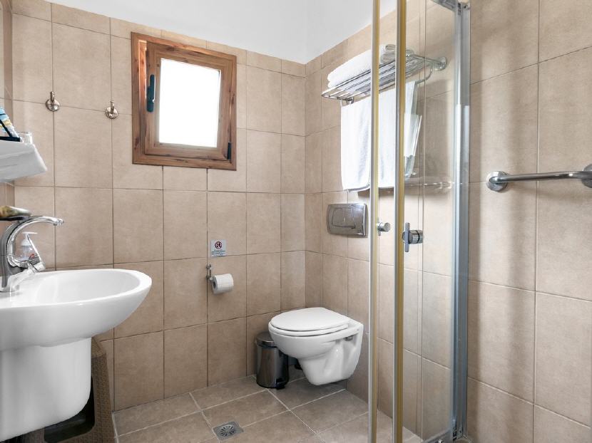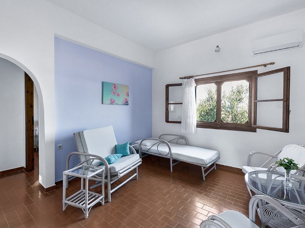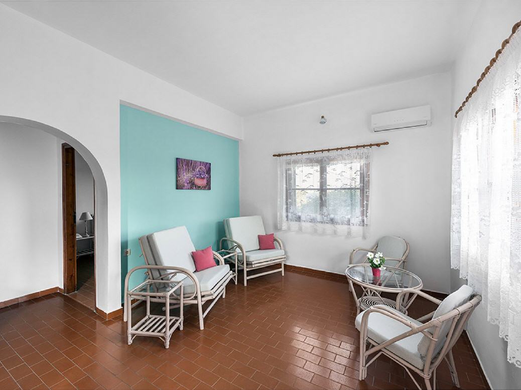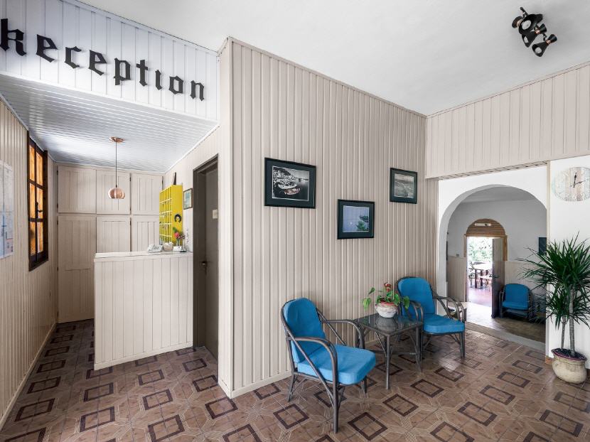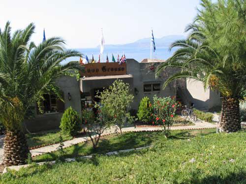 Die Anlage verfügt im Hauptgebäude über Rezeption, Aufenthaltsraum mit TV, Bar und eine große Terrasse, auf der Sie Frühstück und Getränke bestellen können. Sie bietet einen herrlichen Blick auf die gesamte Bucht und den Strand. Der Zugang zu der umzäunten Anlage erfolgt entweder von der Strandseite oder Ortseite aus jeweils durch ein Gittertor.