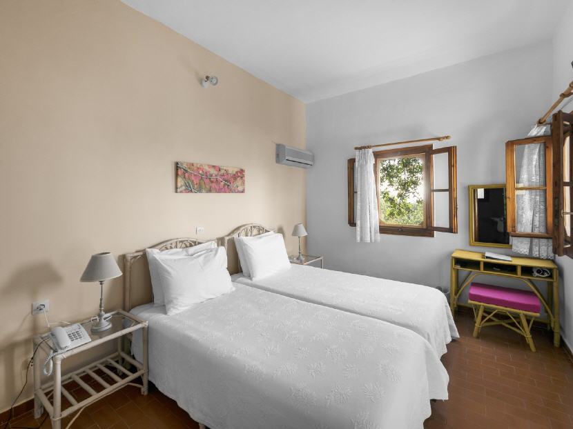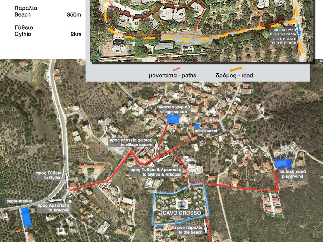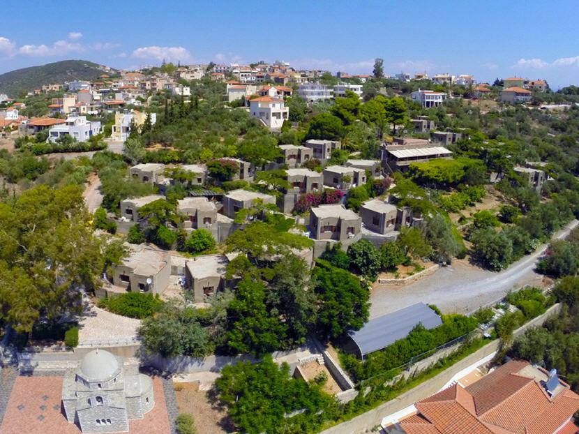Der Baustil der Bungalows ist dem der Burghäuser von Mani nachempfunden und vermittelt so eine besondere Atmosphäre. Die Bungalows liegen an schmalen Fußwegen mit Blumenbeeten und Bäumen und verfügen jeweils über einen Vorhof, von dem aus sich ein herrlicher Blick auf das tiefblaue Meer bietet.