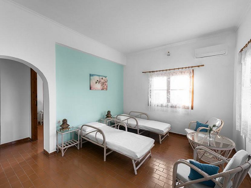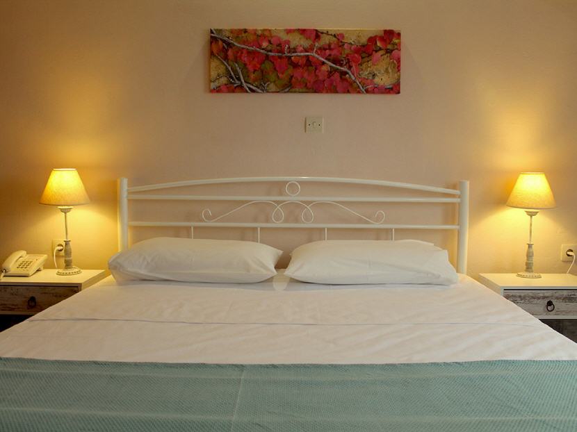 Lage: Völlig ruhig in einem großen Grundstück mit Oliven- und Pinienbäumen in Hanglage am Rande des netten Ortes Mavrovouni. Die Anlage liegt oberhalb des langgezogenen Sandstrandes, den man über eine kleine Seitenstraße erreicht. Entlang des Strandes finden Sie 3 Tavernen und eine Strandbar, in 1,5km Entfernung befindet sich eine Surfschule.