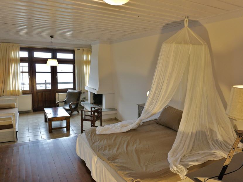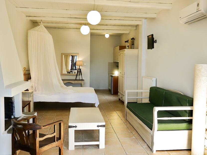 Die Studios bestehen aus einem kombinierten Wohn- und Schlafraum mit Kamin und verfügen über Dusche/WC, eine Kochnische, ein Doppelbett und ein oder zwei Sofas, die als Schlafmöglichkeit für eine dritte oder vierte Person dienen können.