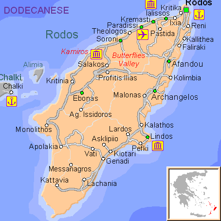 Die „Roseninsel“ Rhodos wird ihrem Namen mit anmutiger Landschaft und üppiger Vegetation mit Pinien, Zypressen und Rosen gerecht. Mit Bergen, Tälern und ihren weiten Stränden und kleinen Buchten bietet die Insel beste Voraussetzungen für einen gelungenen Urlaub. Die Akropolis in Lindos sowie der Großmeister – Palast in Rhodos – Stadt sind Zeugen der wechselhaften Inselvergangenheit. Während der Inselnorden mit einer ausgezeichneten touristischen Infrastruktur gut erschlossen ist, findet man in Süden absolute Ruhe an fast menschenleeren Stränden. Im Inselinneren trifft man auf kleine, unberührte Dörfer, in denen das Kafenion noch wie eh und jäh die Nachrichtenzentrale der Bewohnen ist. Das idyllische Schmetterlingstal im Norden und die antiken Thermen von Kallithea gehören ebenso zu den Sehenswürdigkeiten der Insel wie die Johanniter – Altstadt der Inselhauptstadt.